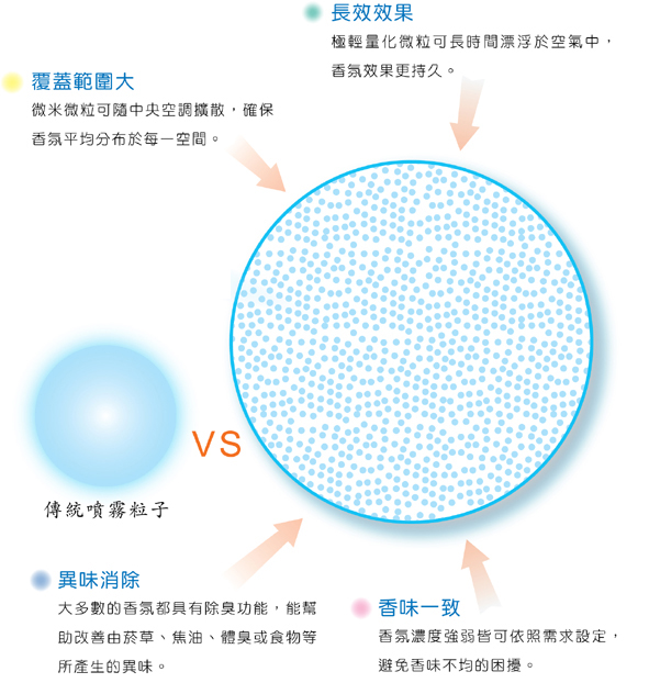 | Scentist 的微粒霧化技術在消除異味、氛圍改善、產品宣傳、衛生維護及芳香表現上創造了空氣處理應用技術的劃時代突破,這些液珠的功能如同香味或異味中合元素的載體,可幫助空氣處裡媒介更有效率地融合於空氣氛圍之中。 |